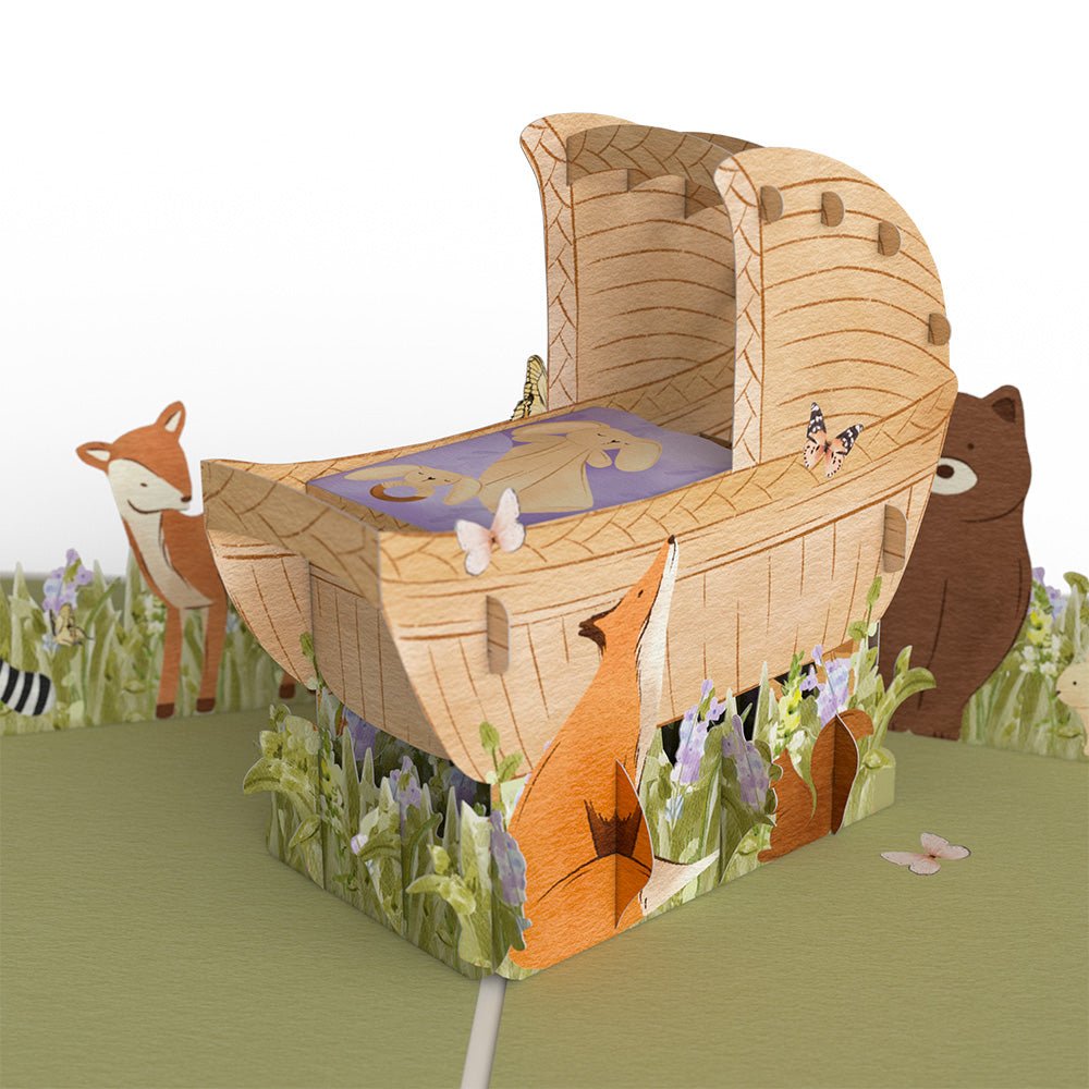 Description: Celebrate the newest arrival with this sweet woodland creature pop-up card that features a fox, bear, butterflies, and other animals. Give it to friends and family who are welcoming a new baby into their lives whether through giving birth, surrogacy, or adoption.